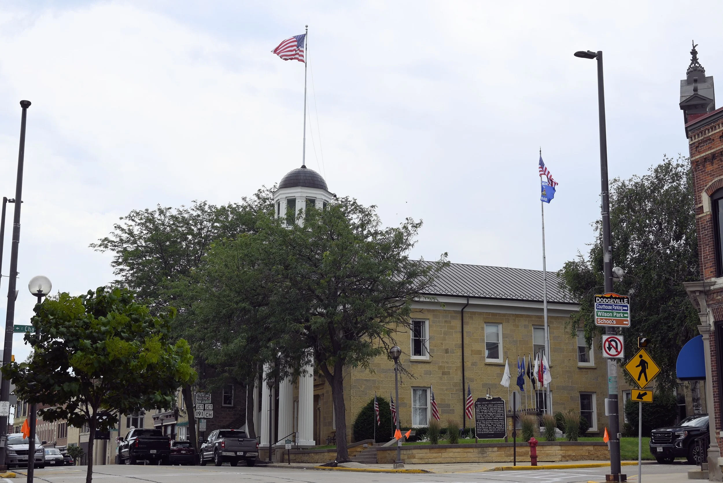 Photo with flag: Iowa County courthouse in Dodgeville, Wisconsin. July 2024, Gary Cole